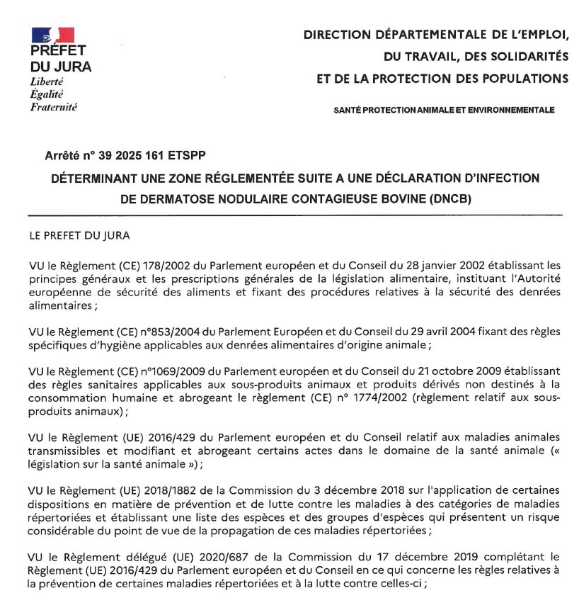Dans le cadre de la confirmation de foyers de dermatose nodulaire contagieuse (DNC) à Ecleux dans le Jura