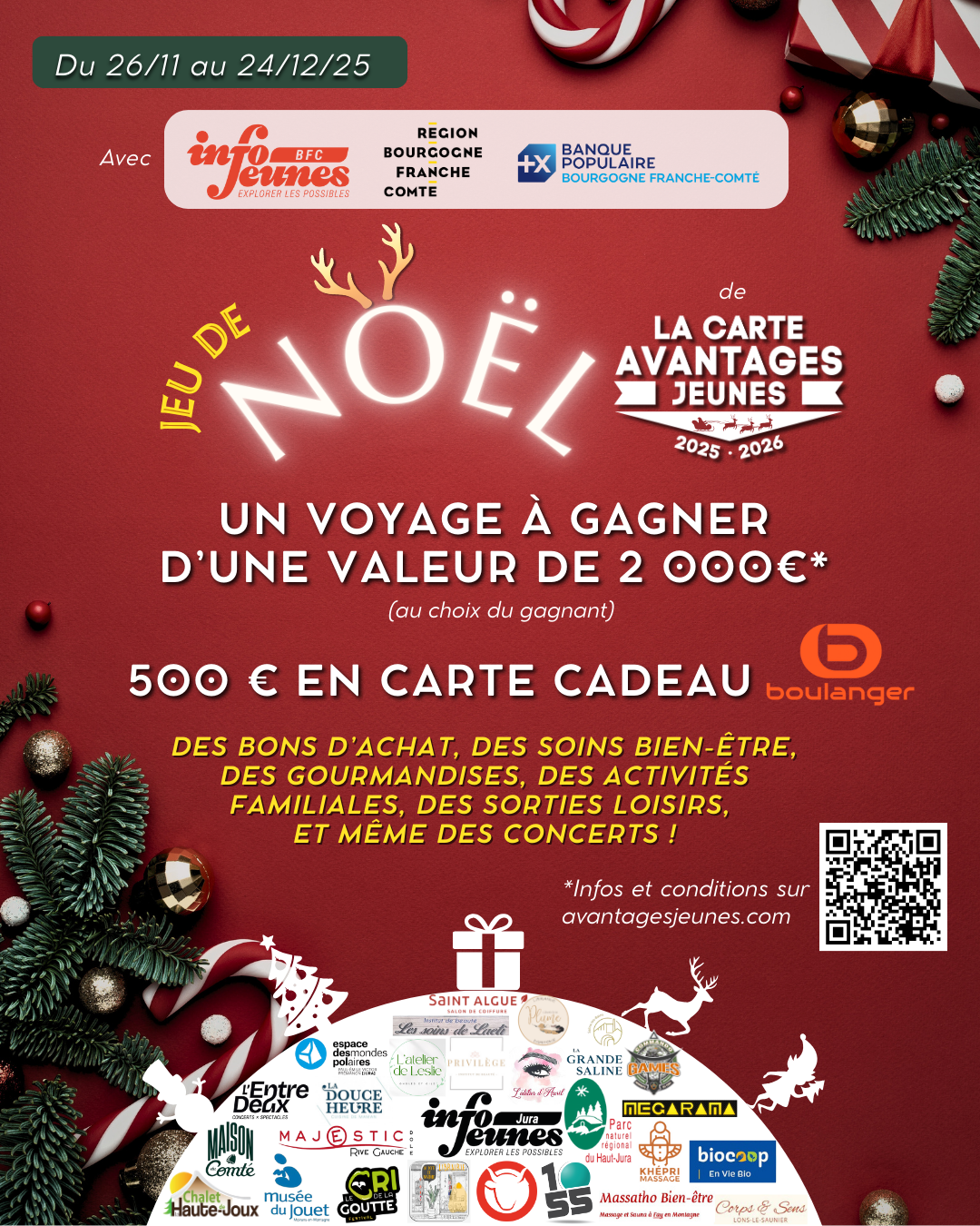 Grand Jeu de Noël de la carte Avantages Jeunes du Jura, qui se déroule du 26 novembre au 24 décembre 2025.