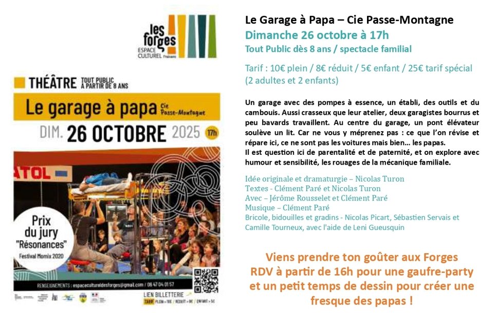 Ce spectacle sera joué le dimanche 26 octobre à 17h et en amont, dès 16h, sera proposer une gaufre-party et un temps de dessin pour réaliser une fresque des papas.
