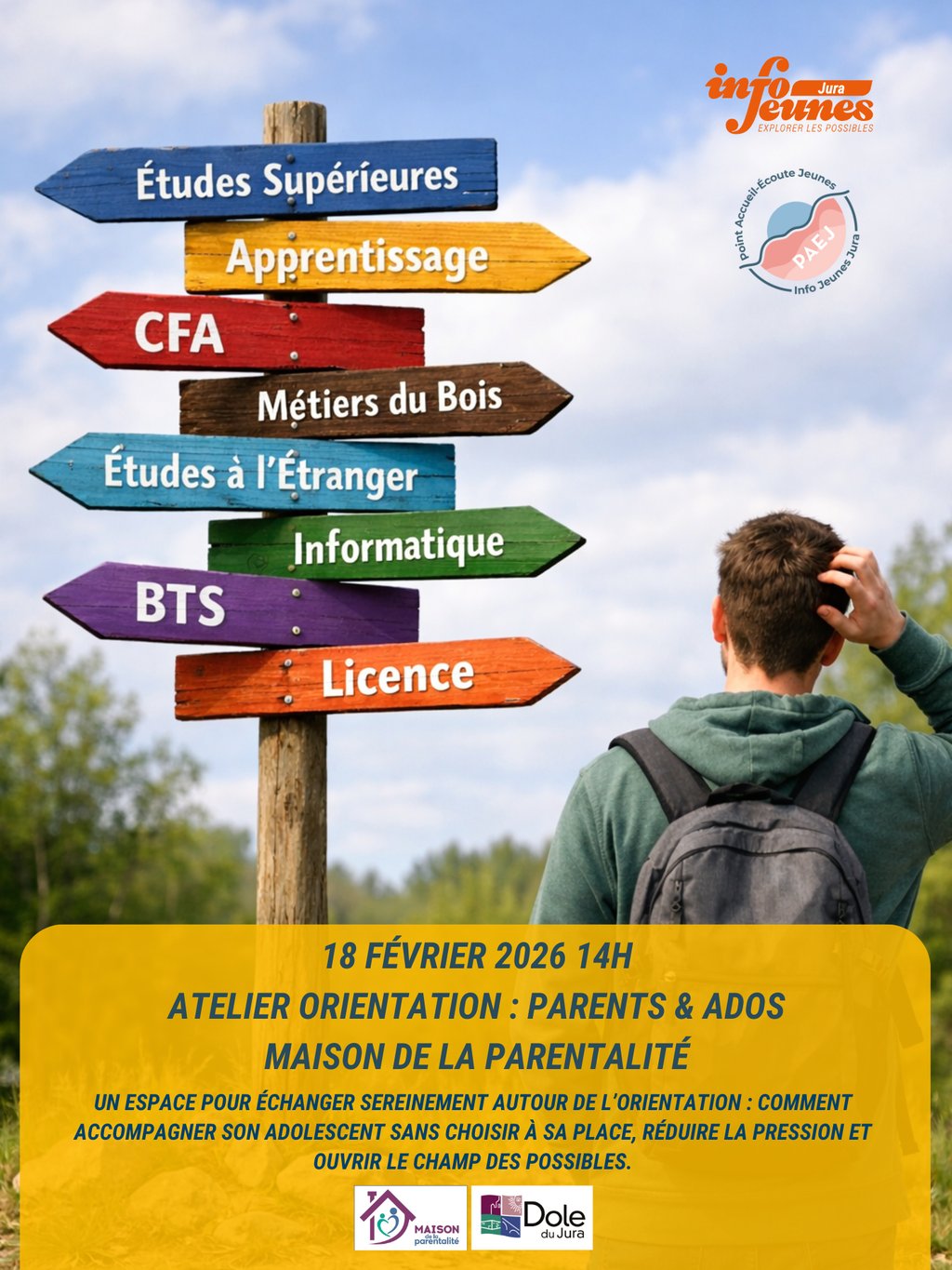 Organisation d’un atelier d’orientation spécialement dédié aux parents et adolescents, le mercredi 18 février 2026 à 14h, à la Maison de la Parentalité à Dole.